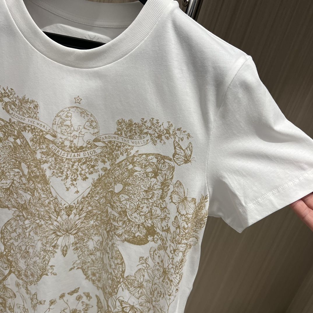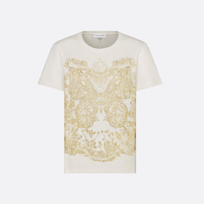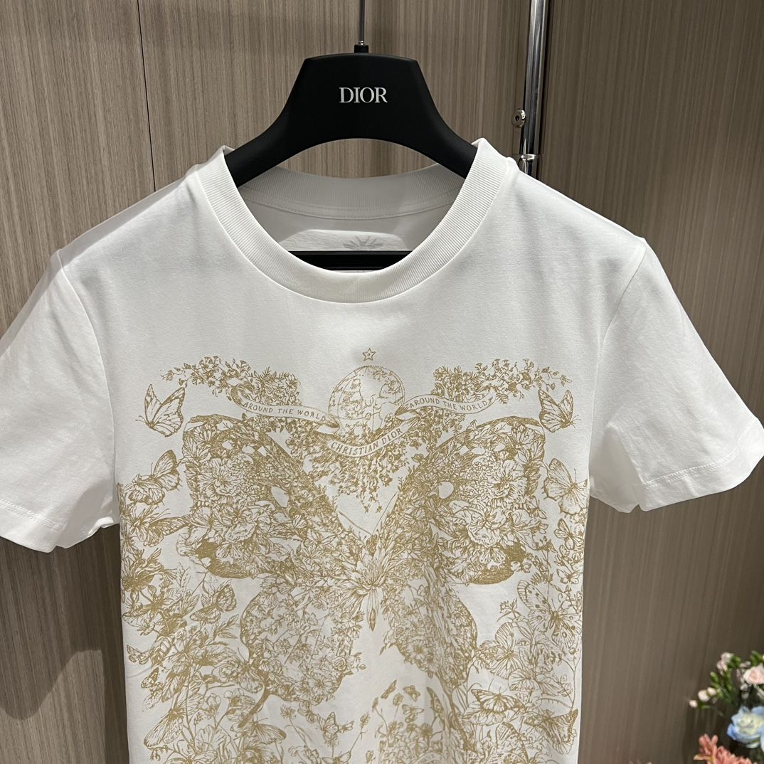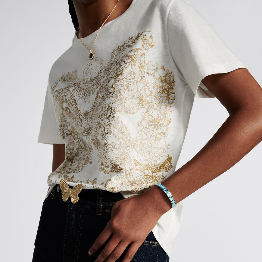 - This T-shirt is decorated with a gold-toned Butterfly Around the World graphic, highlighting the collection's classic butterfly theme, and is embellished with the words L'envol des papillons dévoile nos désirs aux étoiles. Crafted from white cotton and linen-blend jersey, it has a classic crew neck cut that goes well with a variety of looks throughout the season.