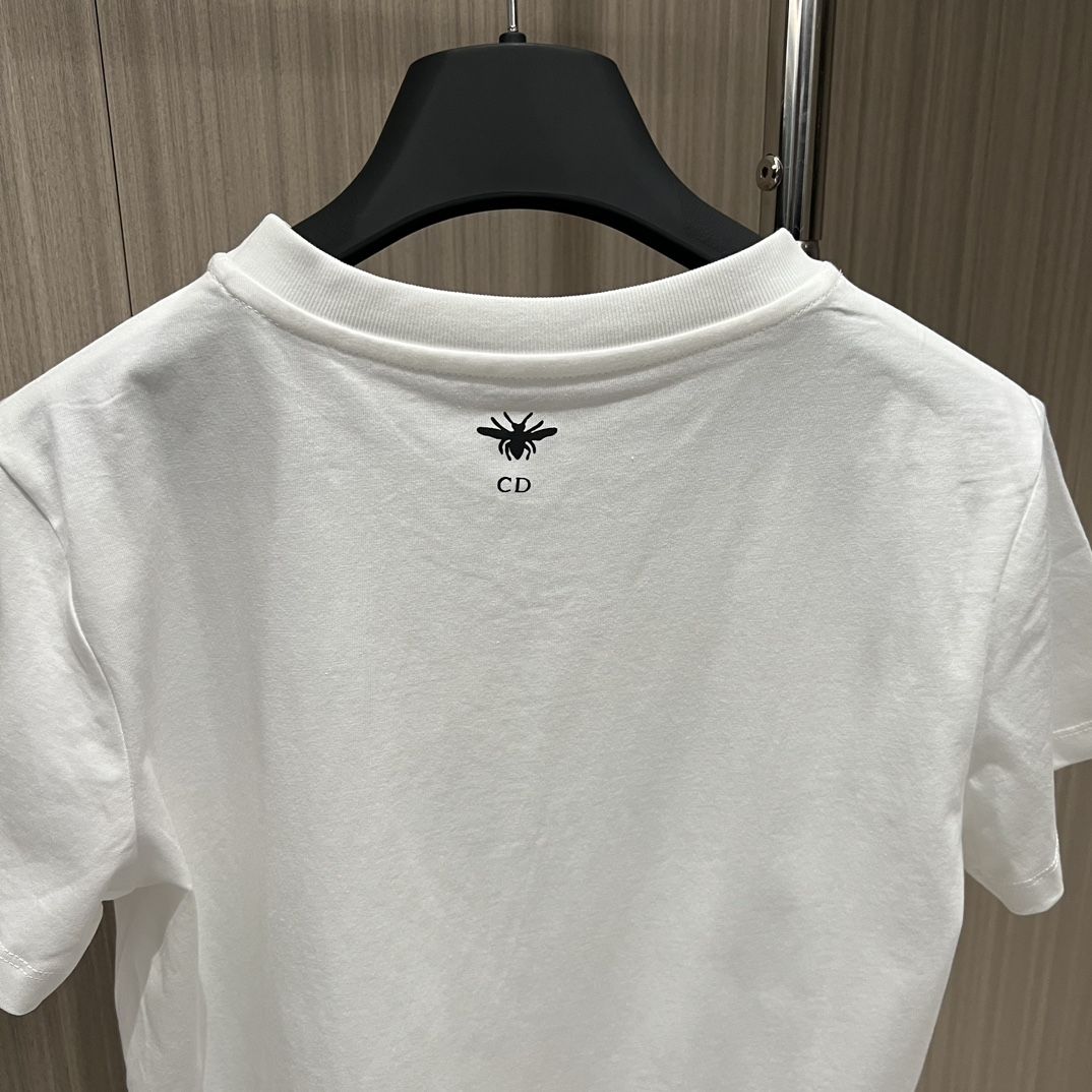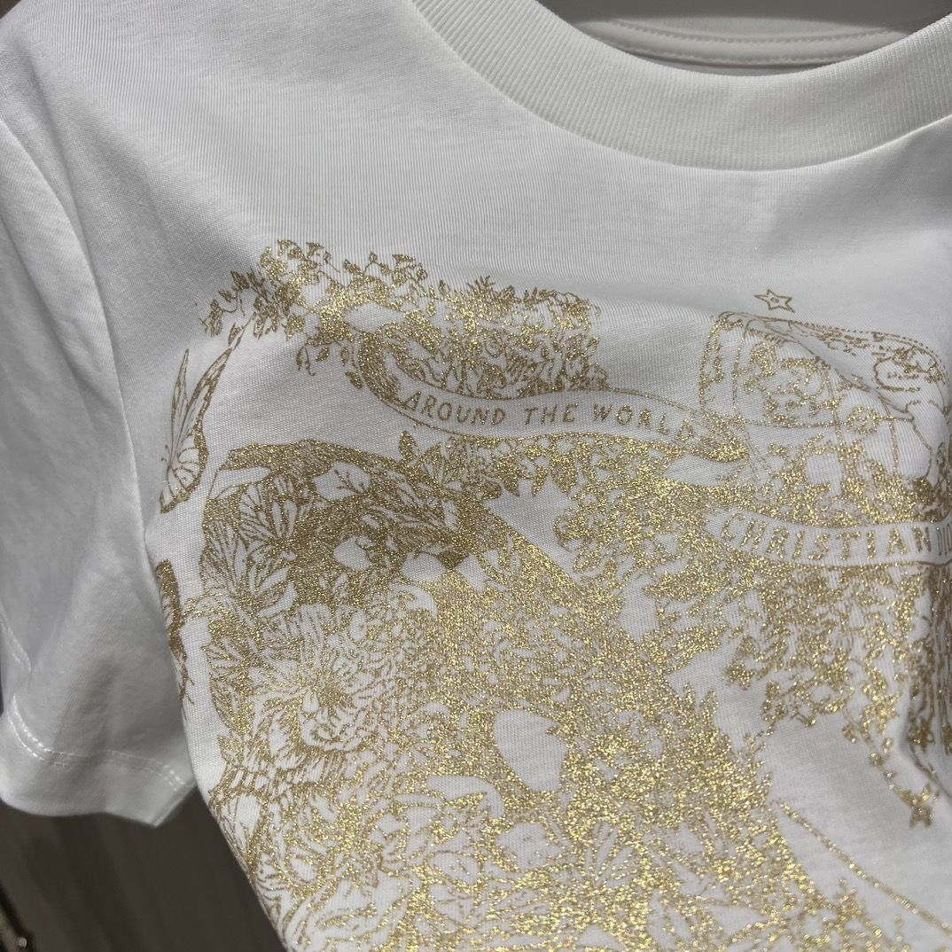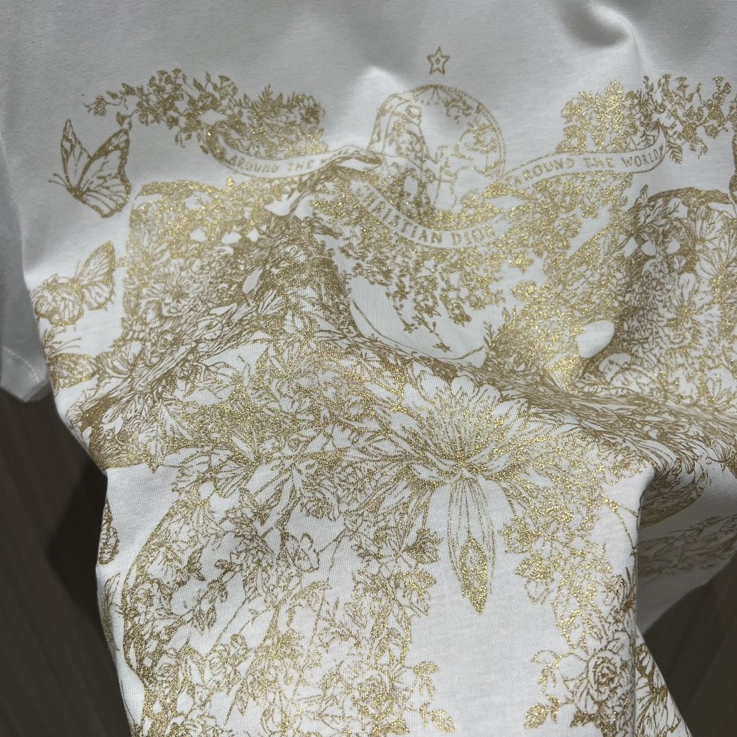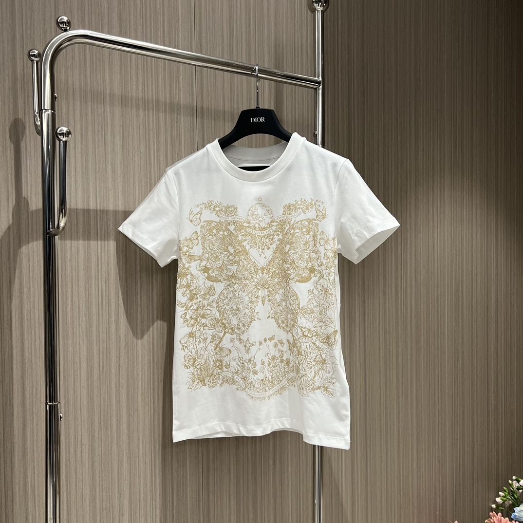 - This T-shirt is decorated with a gold-toned Butterfly Around the World graphic, highlighting the collection's classic butterfly theme, and is embellished with the words L'envol des papillons dévoile nos désirs aux étoiles. Crafted from white cotton and linen-blend jersey, it has a classic crew neck cut that goes well with a variety of looks throughout the season.