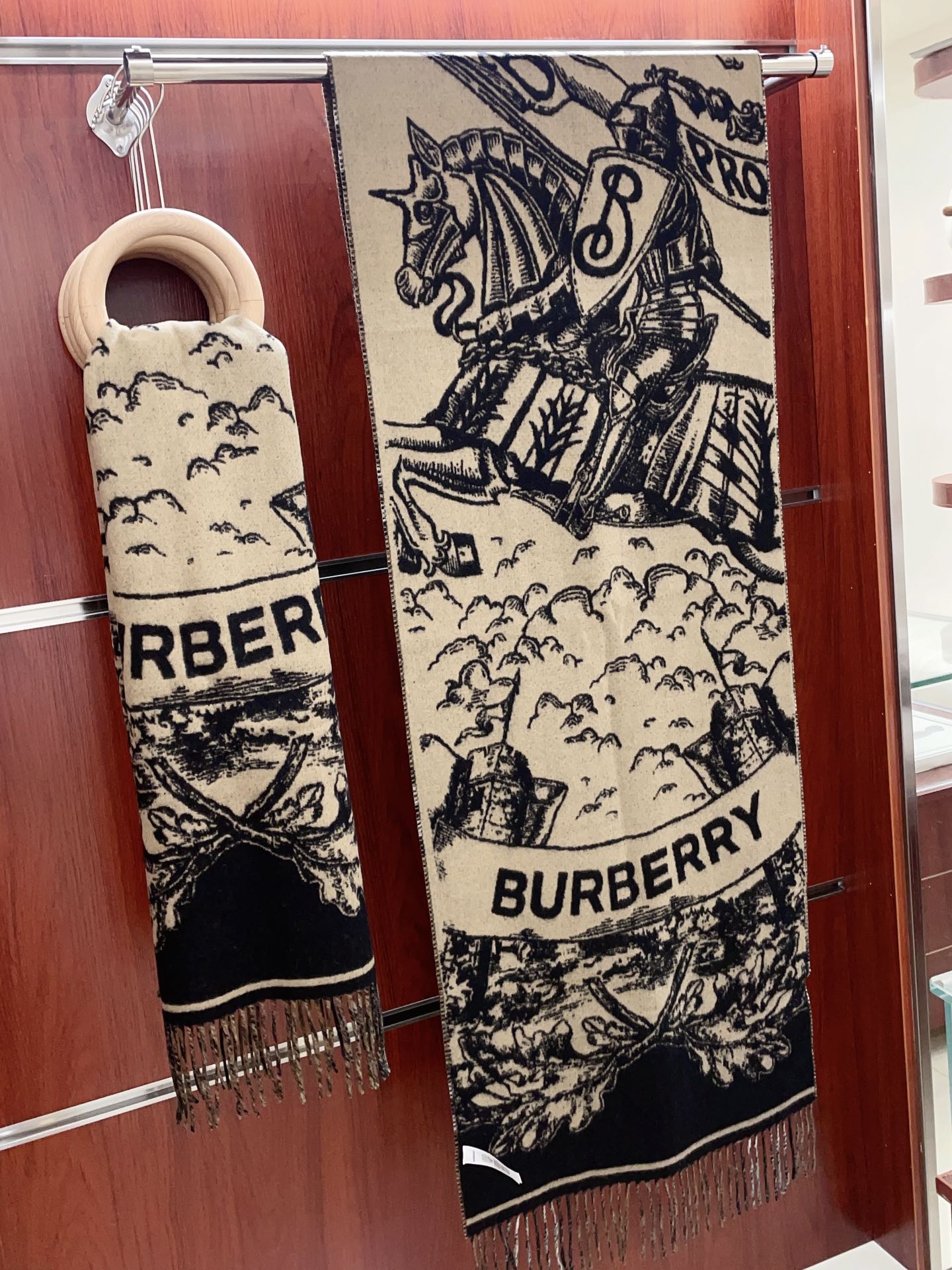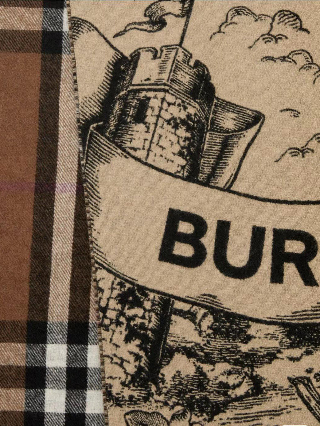 This scarf in jacquard-woven cashmere, reversing from an Exaggerated Check to our Equestrian Knight Design. The hand-drawn illustration incorporates our logo amongst oak leaves and acorns.