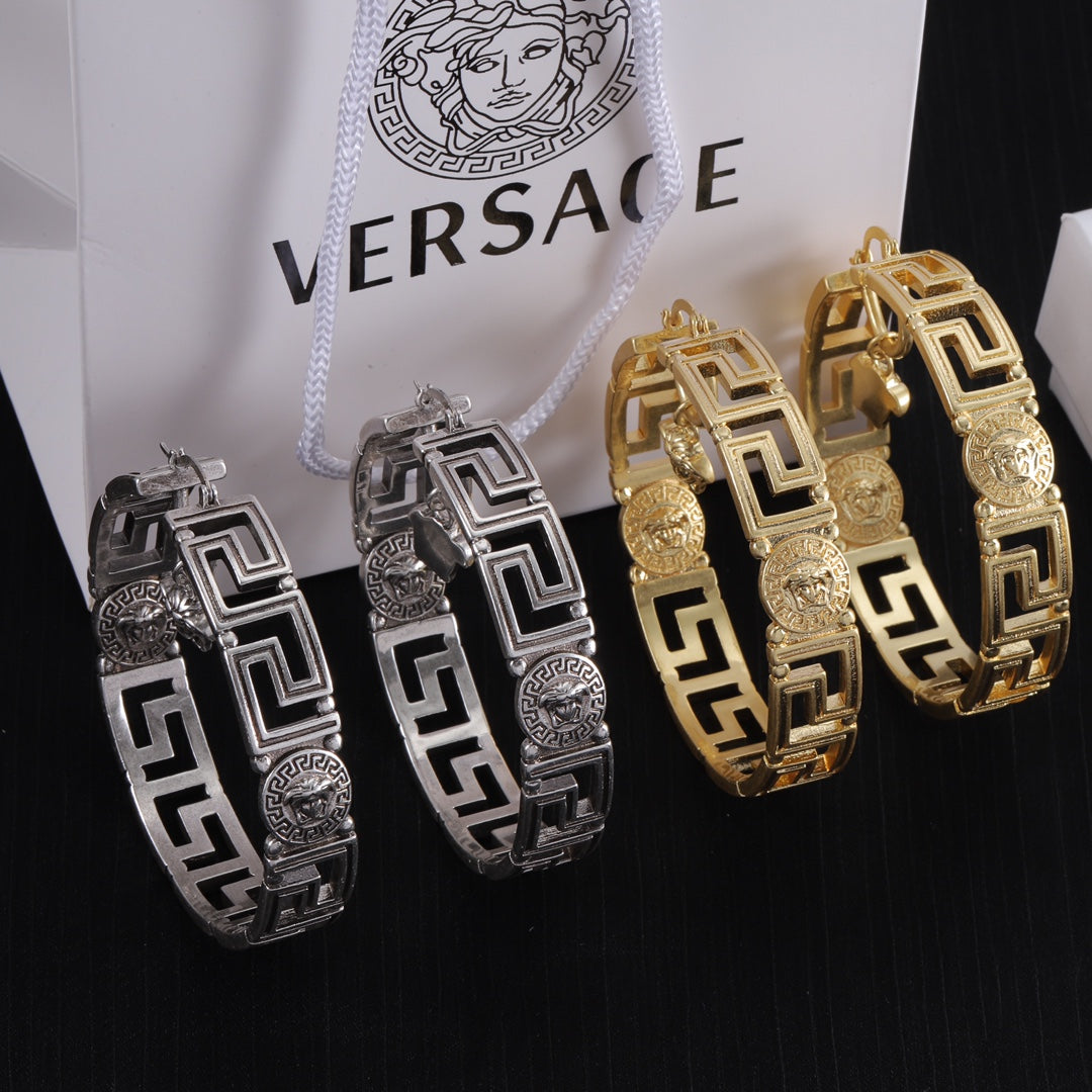 - Loop earrings featuring a Greca pattern with accent Medusa studs and charms.