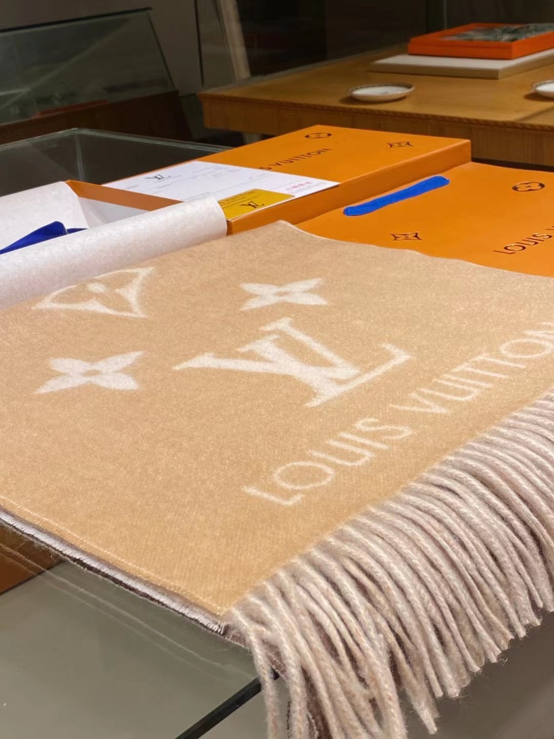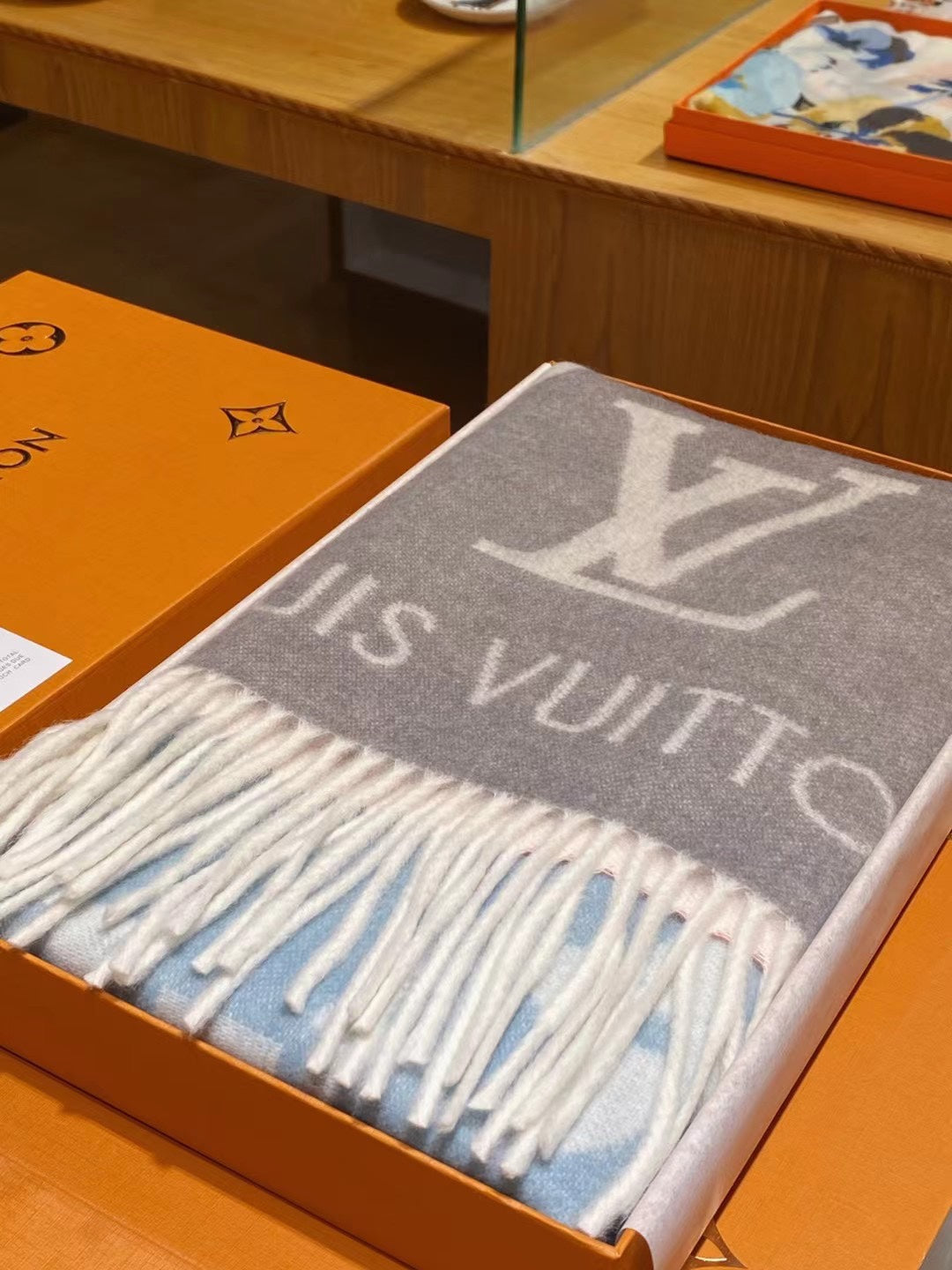 This cashmere scarf uses bold strokes and gradient tones to reinterpret the large embossed pattern, which contrasts with the color on the back, allowing for a variety of styling possibilities.