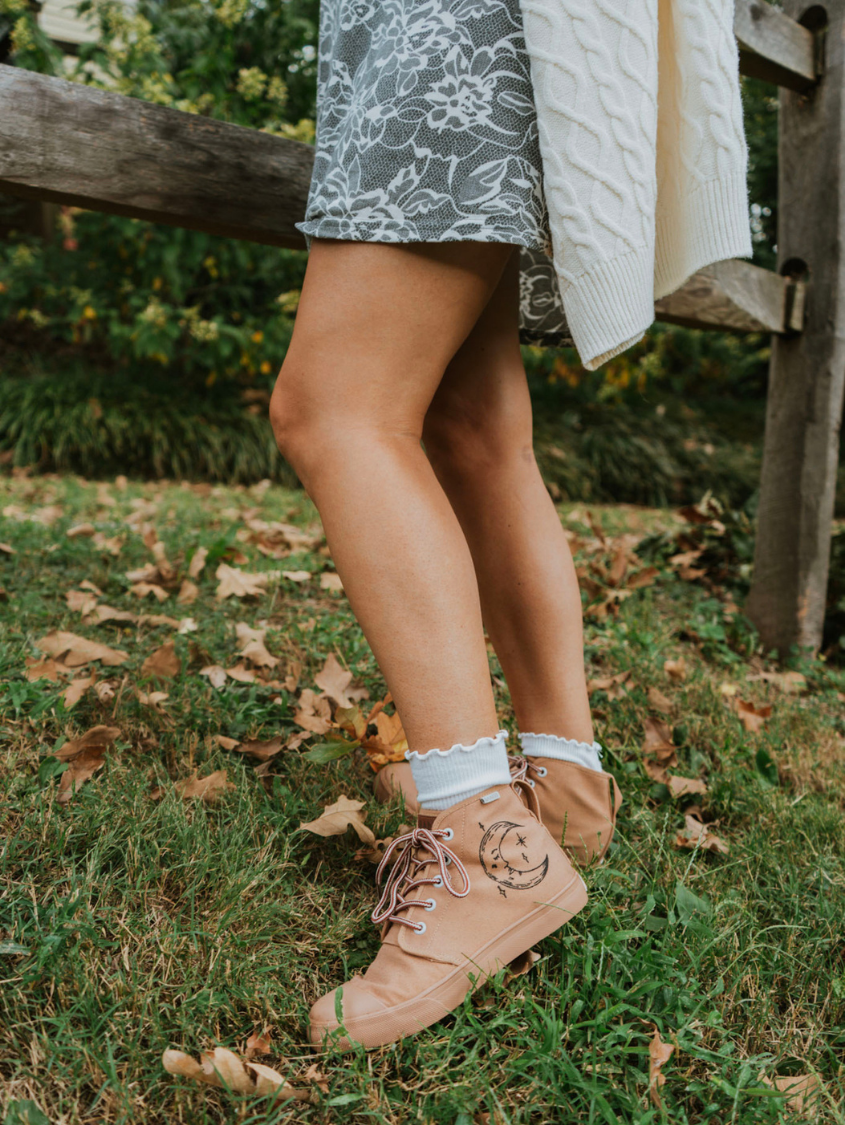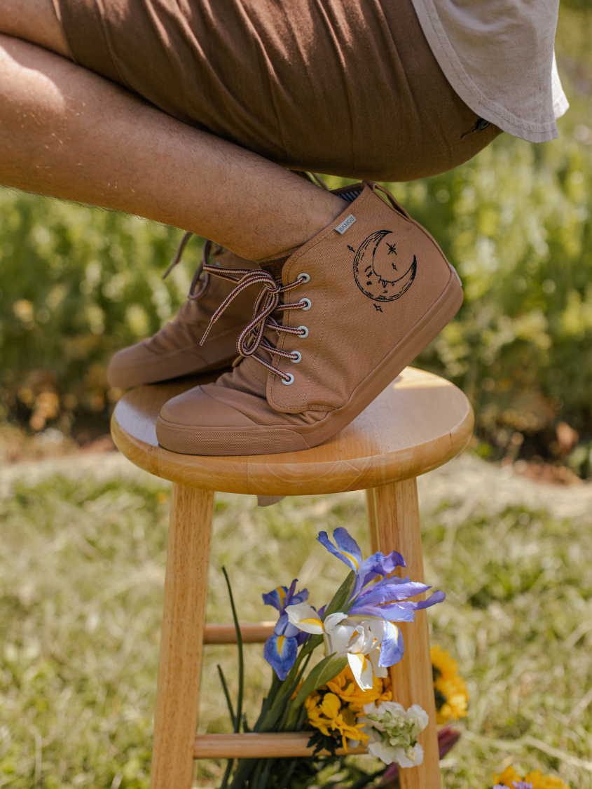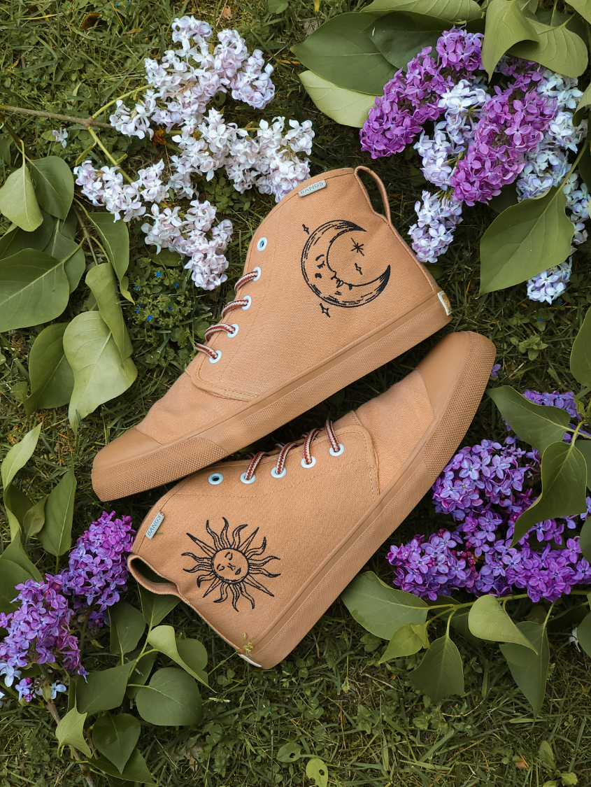 This design on our Zion Sand High Tops (a light khaki color) feature an embroidered sun on your right foot and embroidered moon on your left so you can gaze the day awayyyy dreaming of your next adventure.