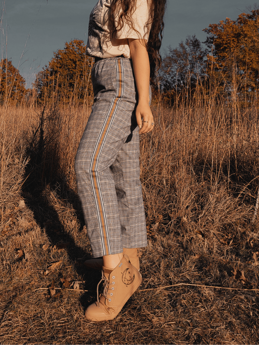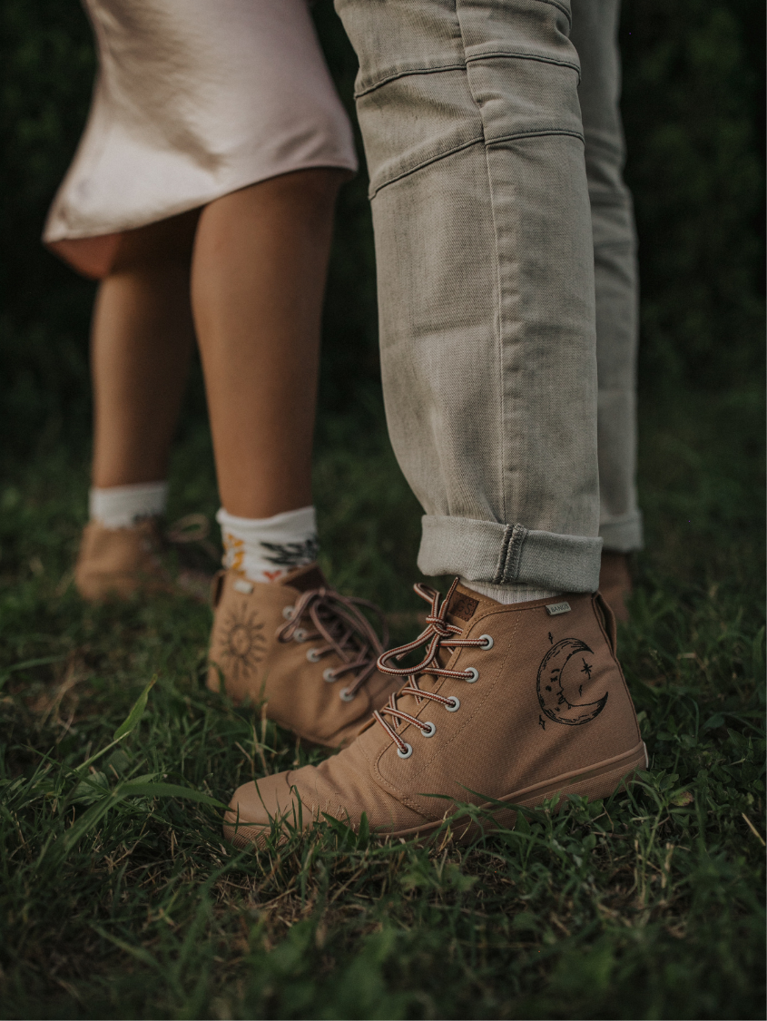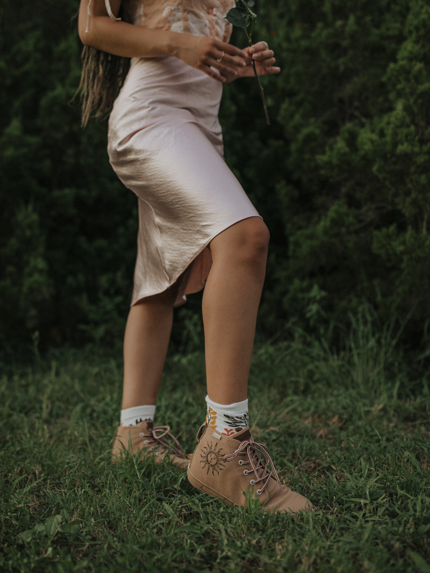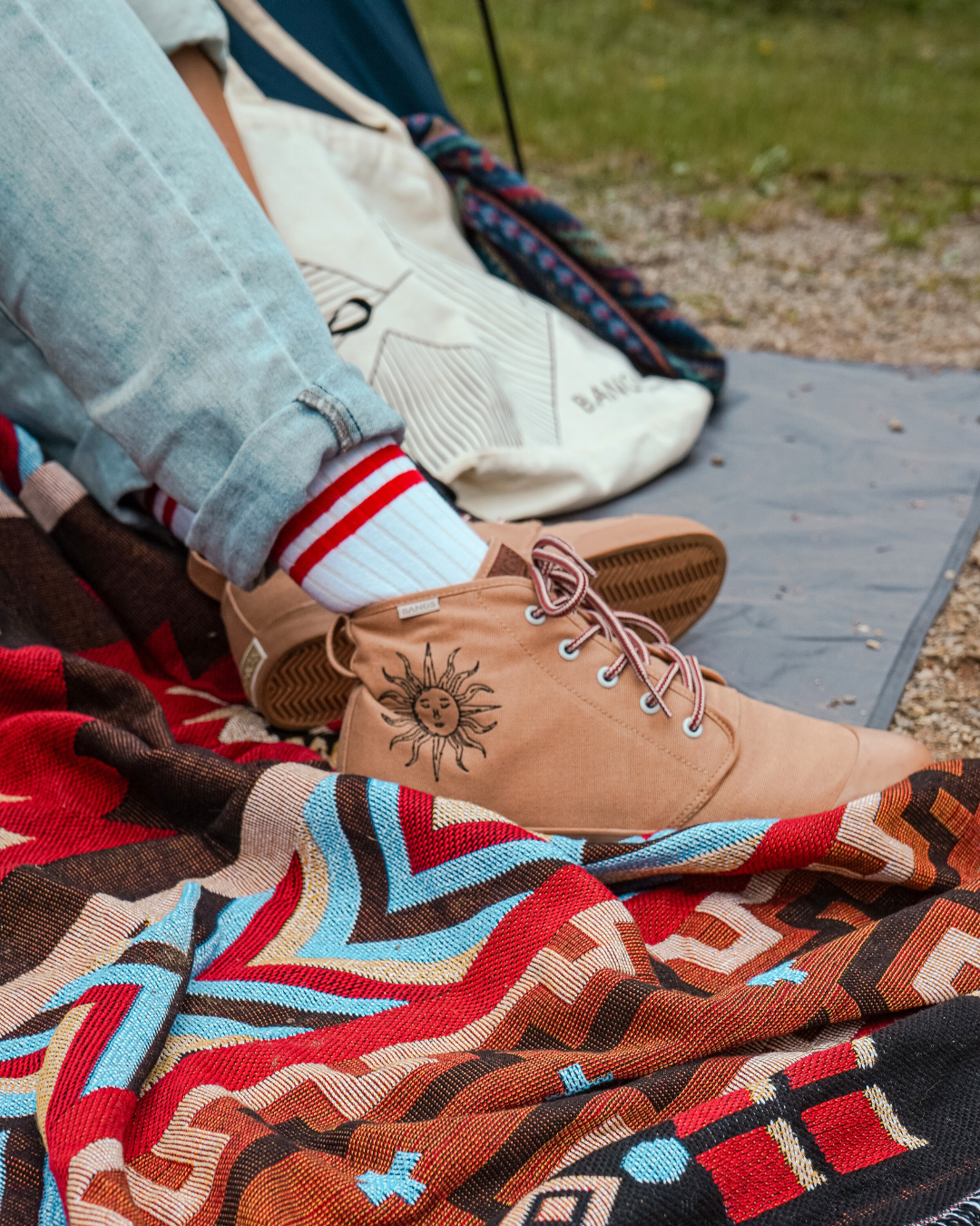 This design on our Zion Sand High Tops (a light khaki color) feature an embroidered sun on your right foot and embroidered moon on your left so you can gaze the day awayyyy dreaming of your next adventure.