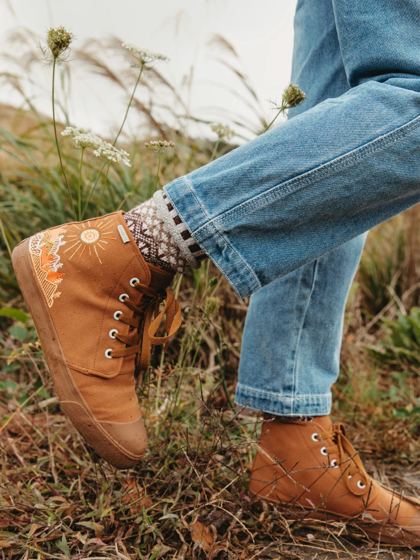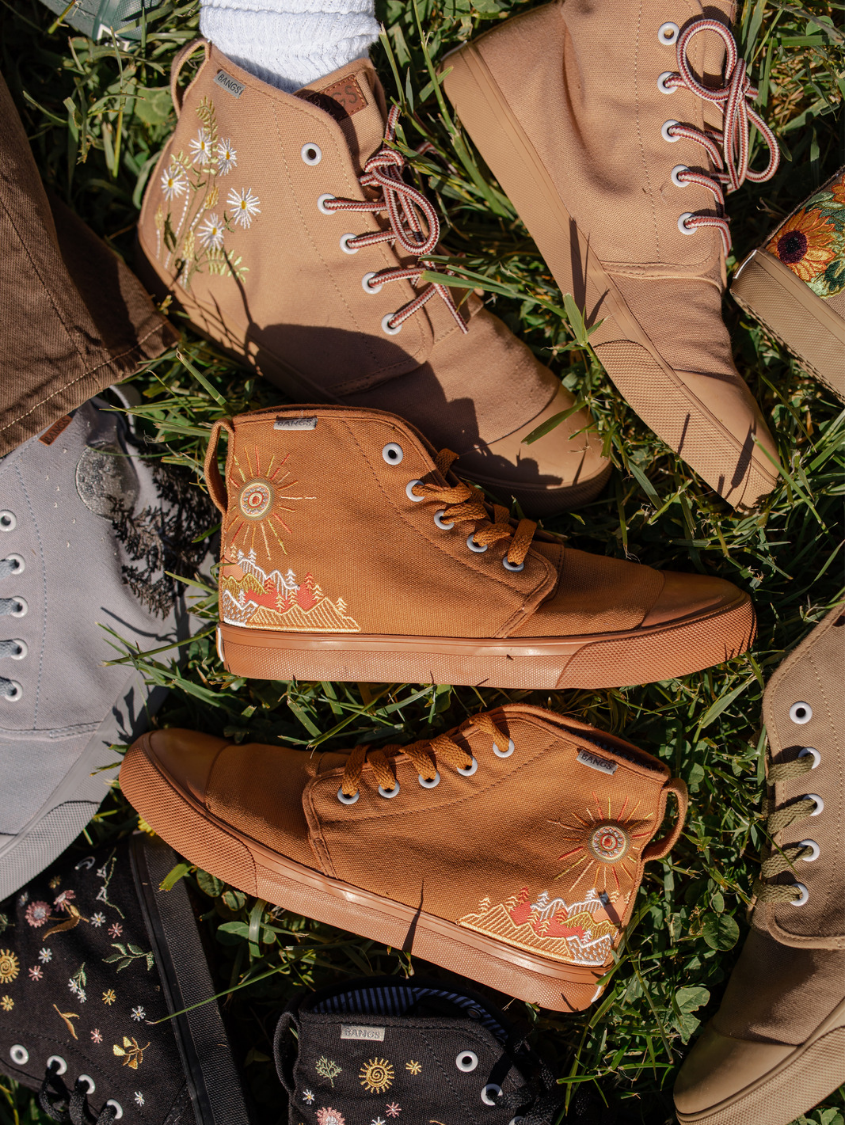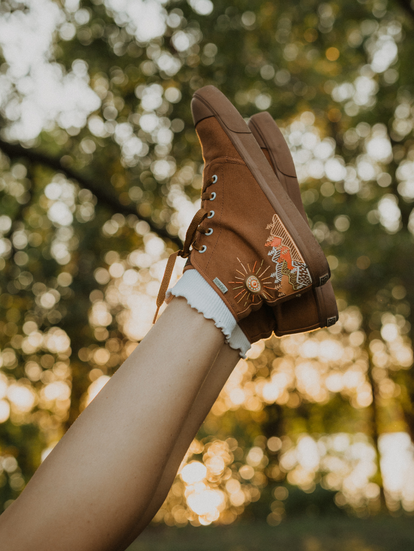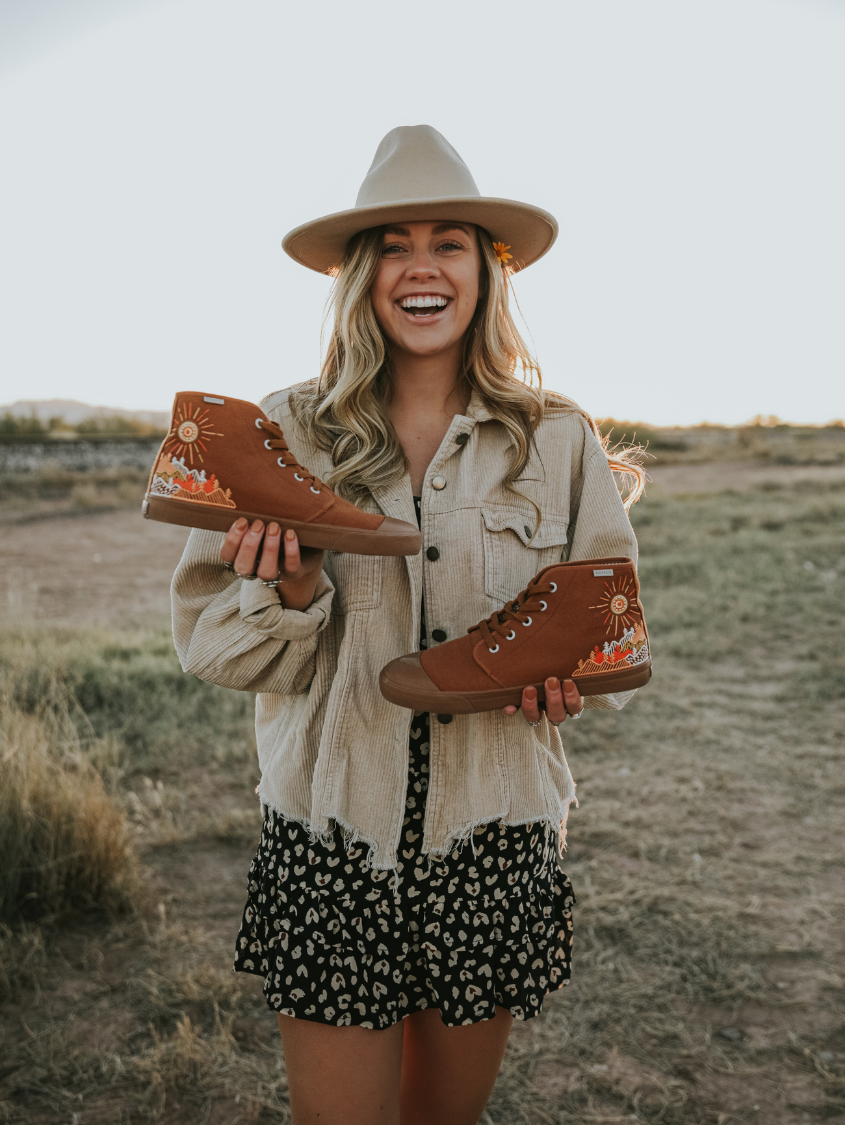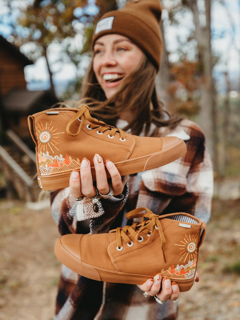 Hey there adventure babe! This mountainous twist on our family-favorite Sahara Sand High Tops is a stunning mix of embroidery and screen-printed mountain sunrise designed by