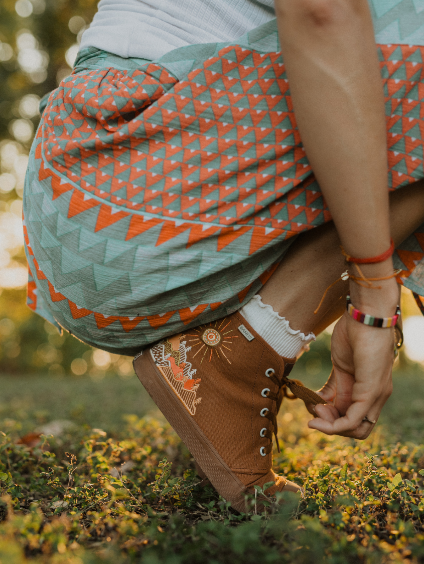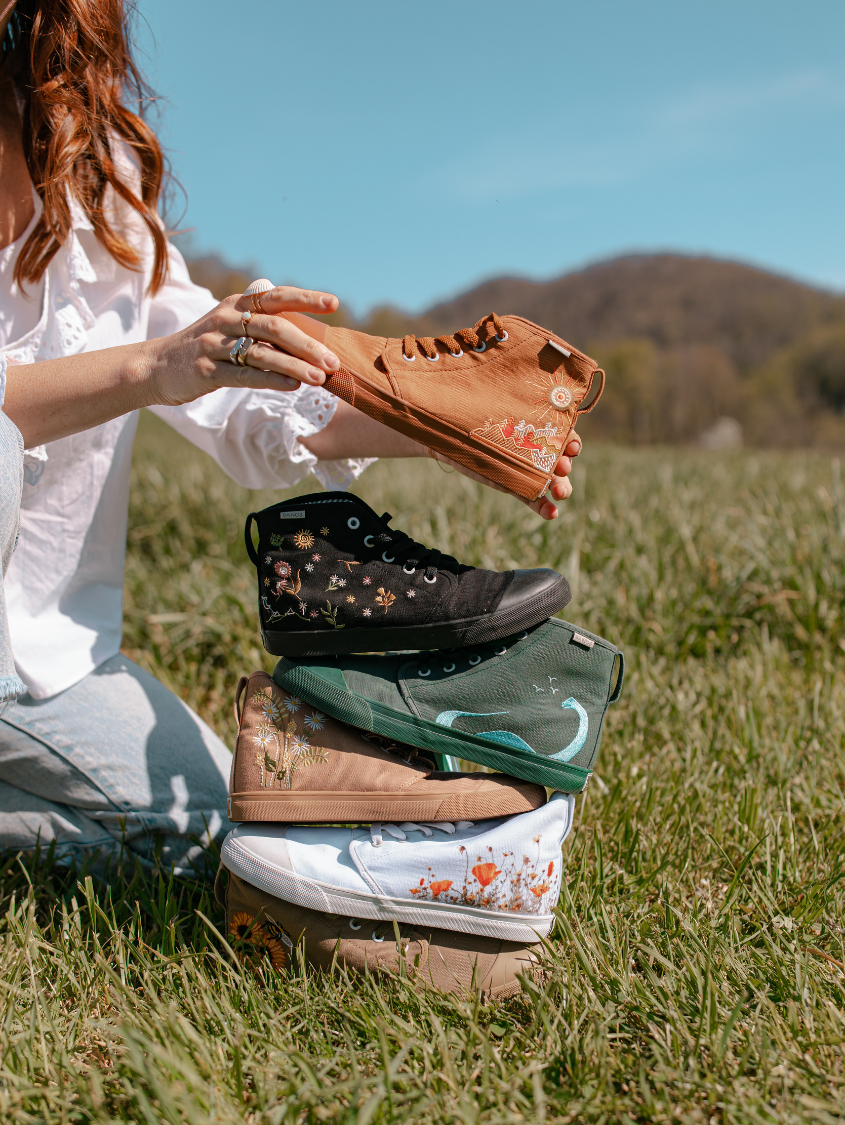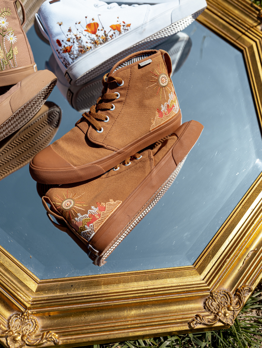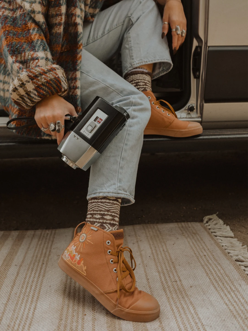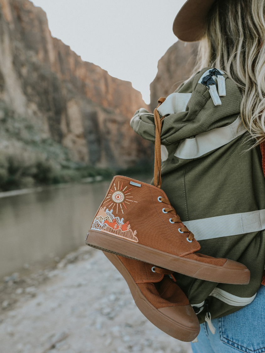 Hey there adventure babe! This mountainous twist on our family-favorite Sahara Sand High Tops is a stunning mix of embroidery and screen-printed mountain sunrise designed by