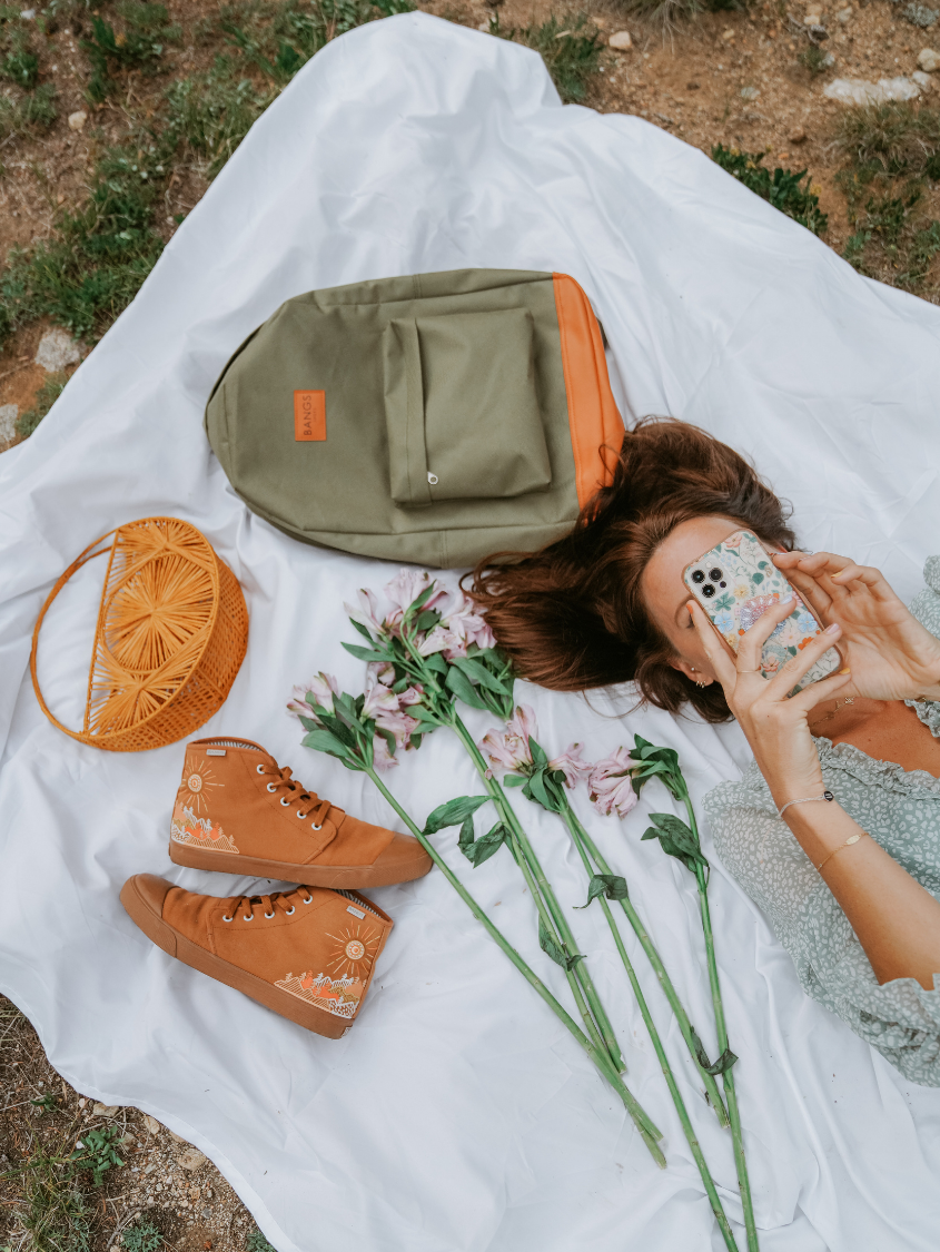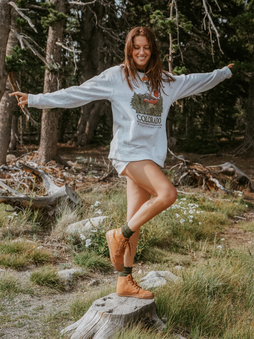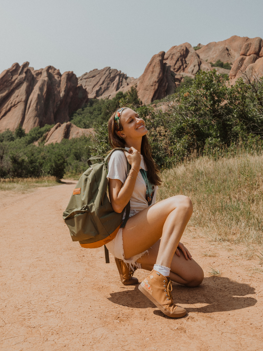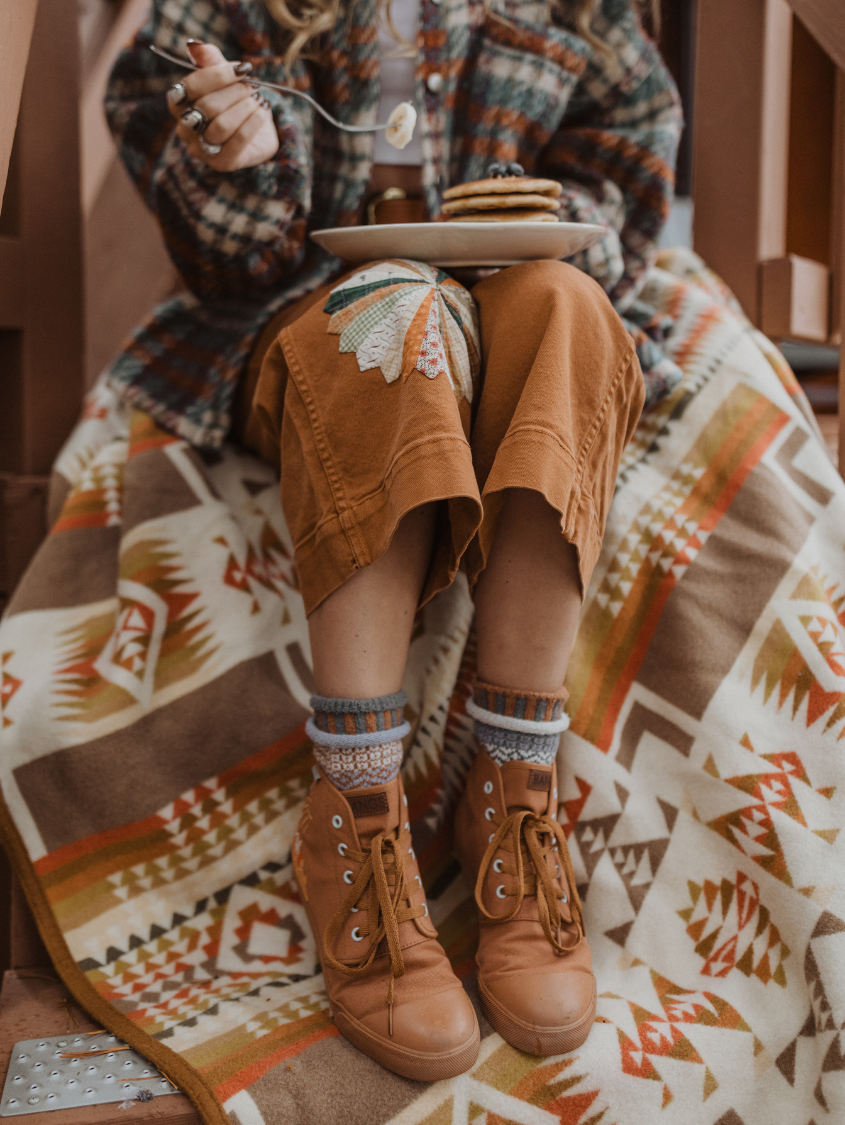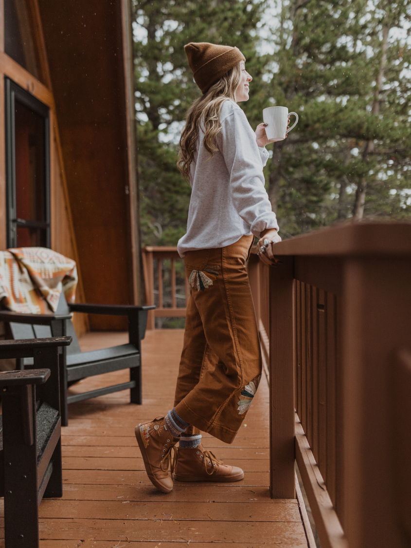 Hey there adventure babe! This mountainous twist on our family-favorite Sahara Sand High Tops is a stunning mix of embroidery and screen-printed mountain sunrise designed by