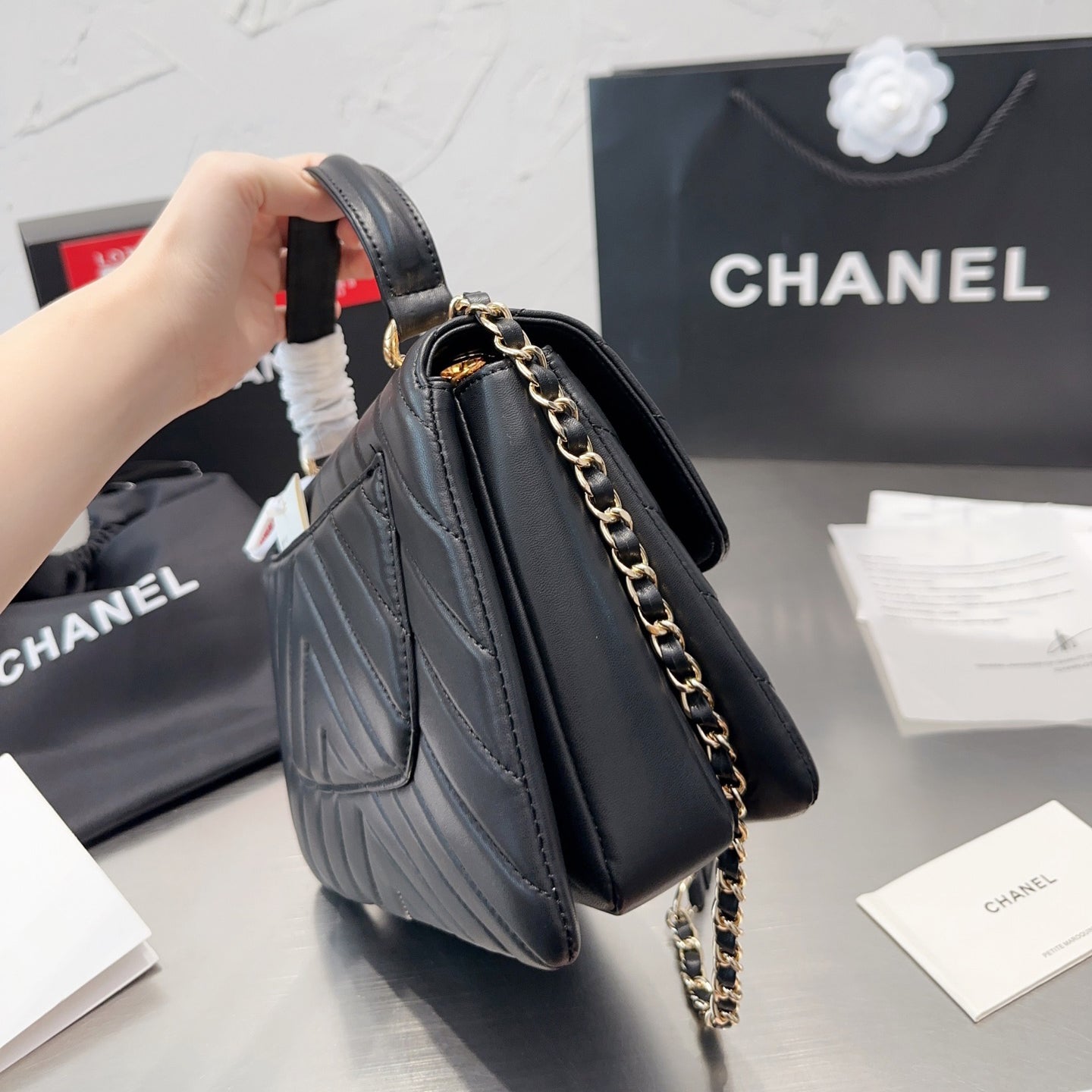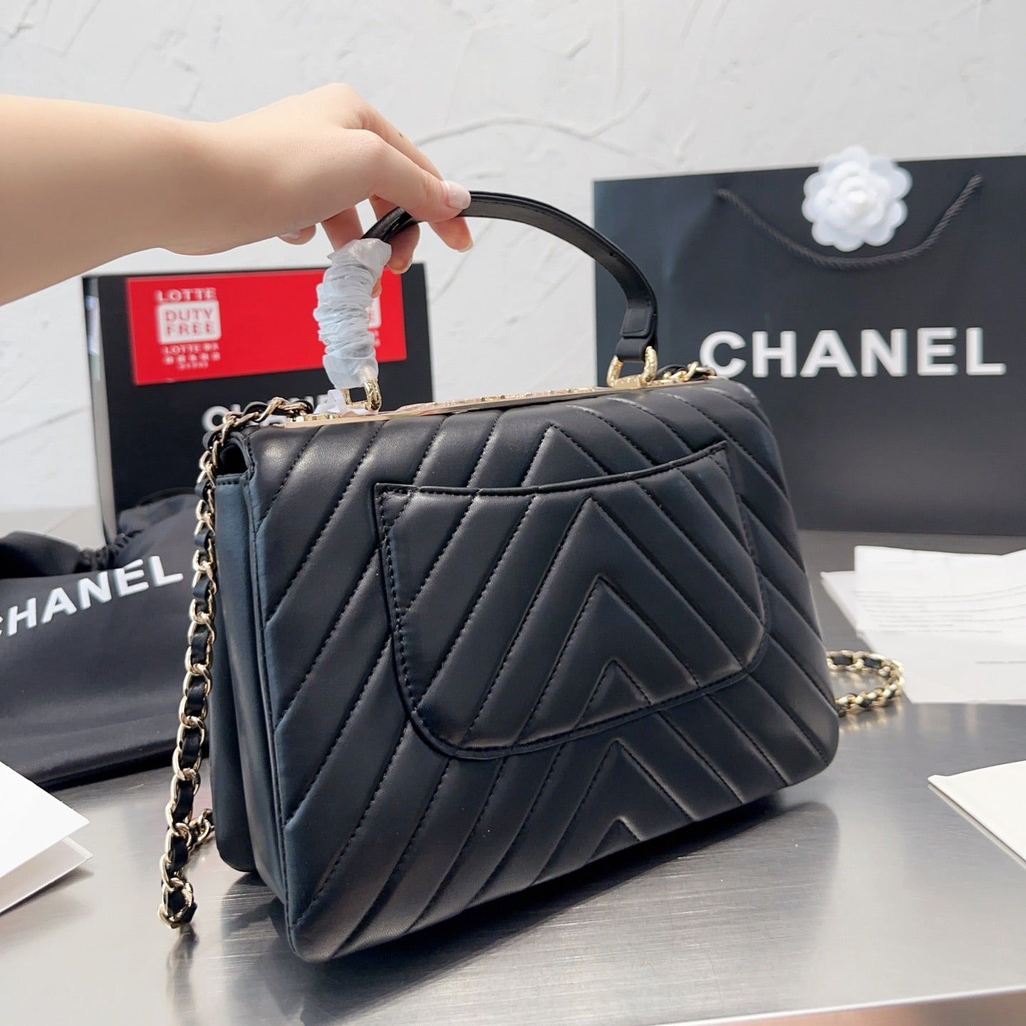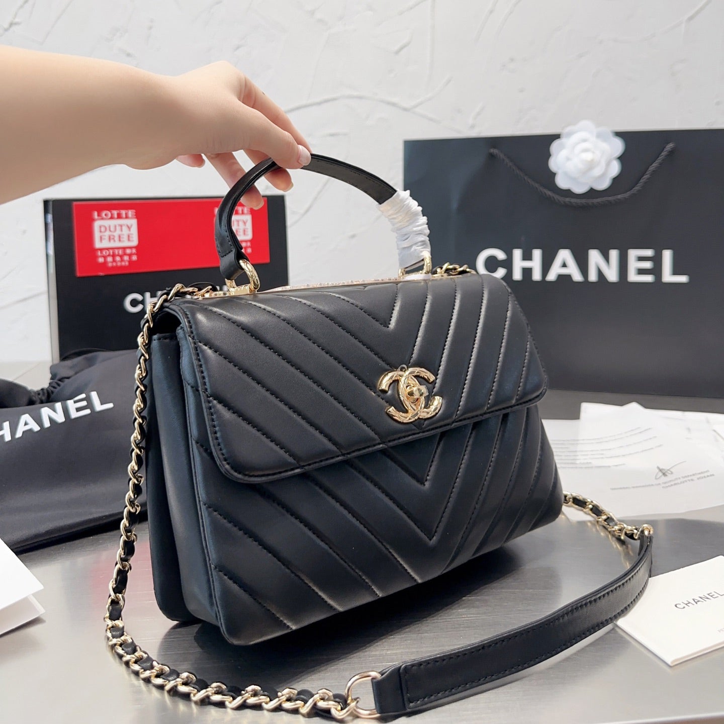 - It's crafted from lambskin in black. topped with pale gold toned. You can use its interwoven chain strap or carry it by its handle.