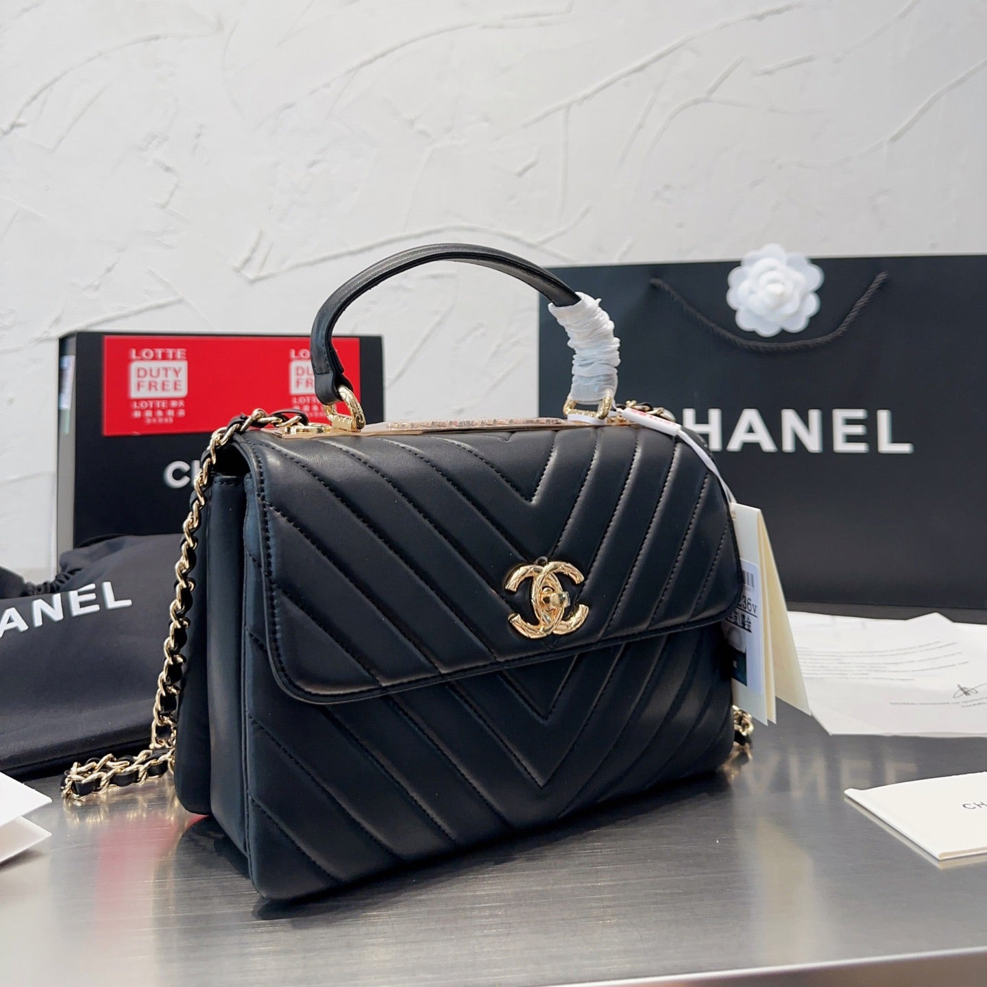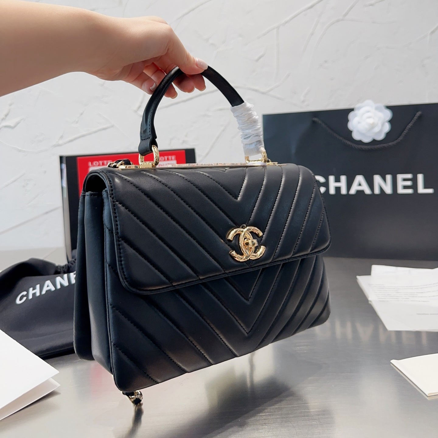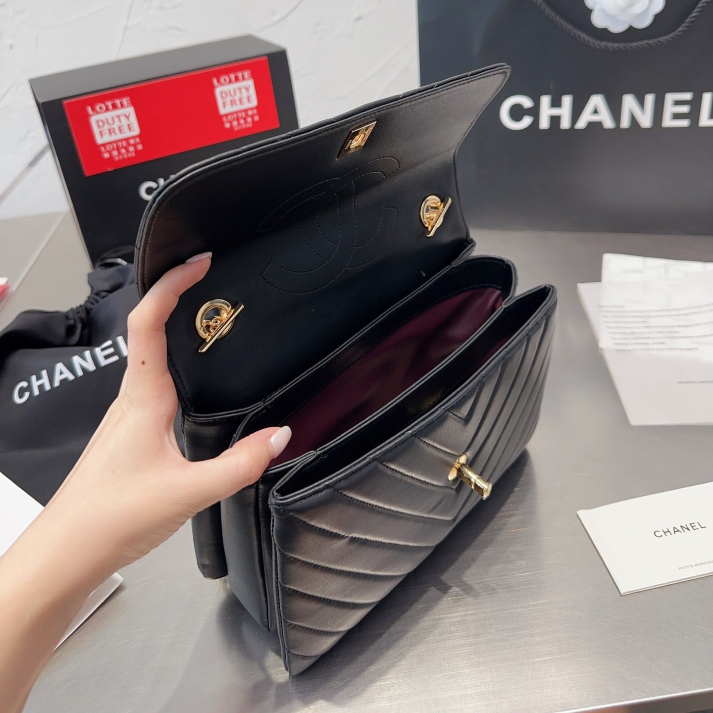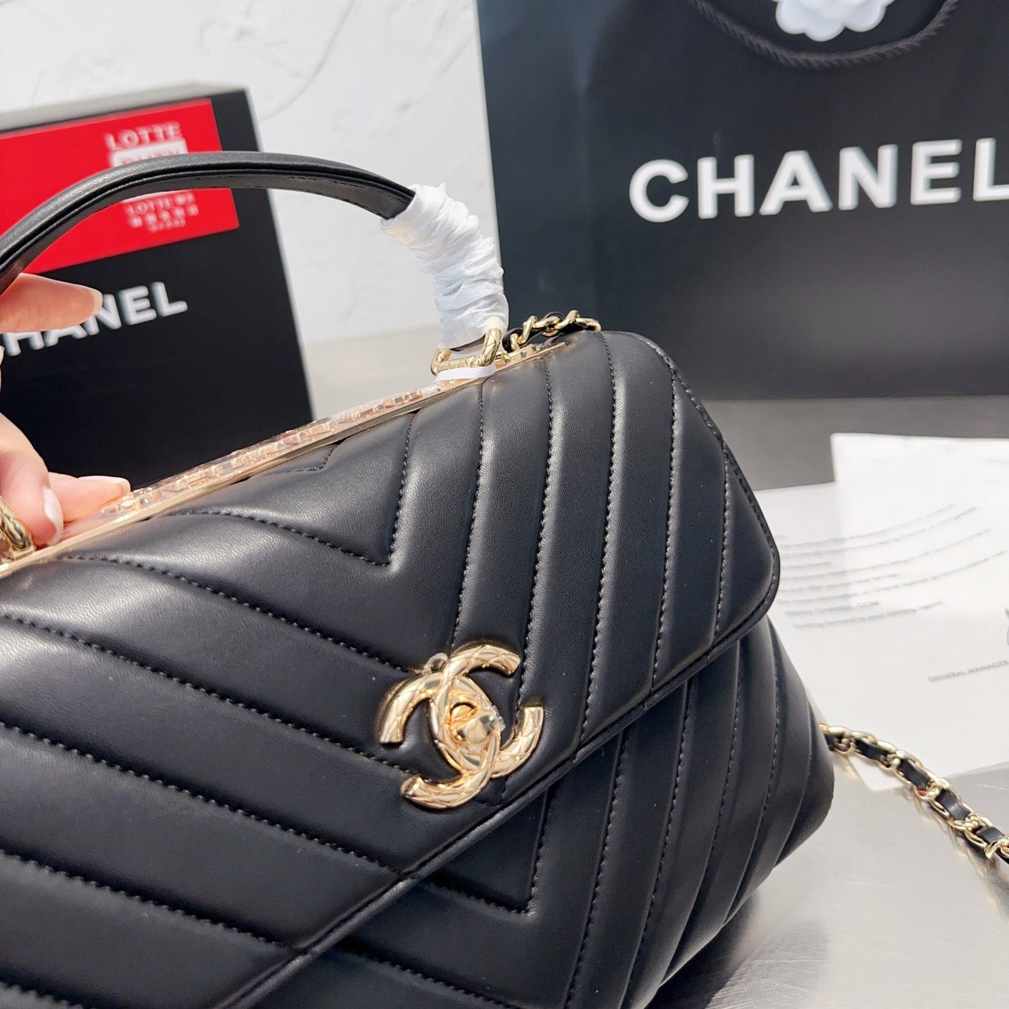 - It's crafted from lambskin in black. topped with pale gold toned. You can use its interwoven chain strap or carry it by its handle.