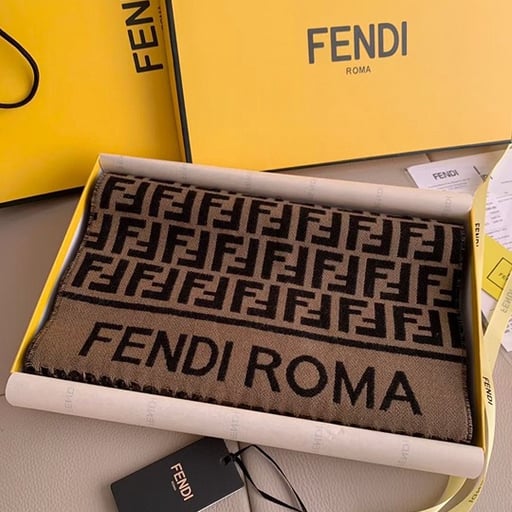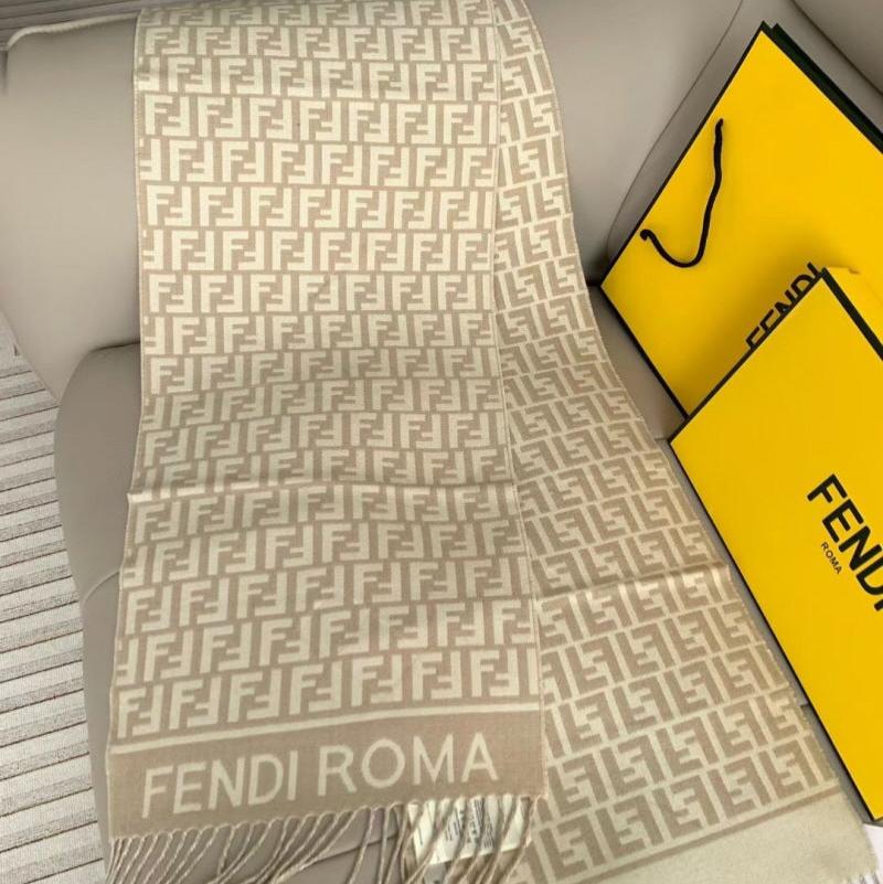 - Scarf made of wool yarn and cashmere with an all-over dove gray jacquard F motif. Embellished with logo and fringes on the ends.
