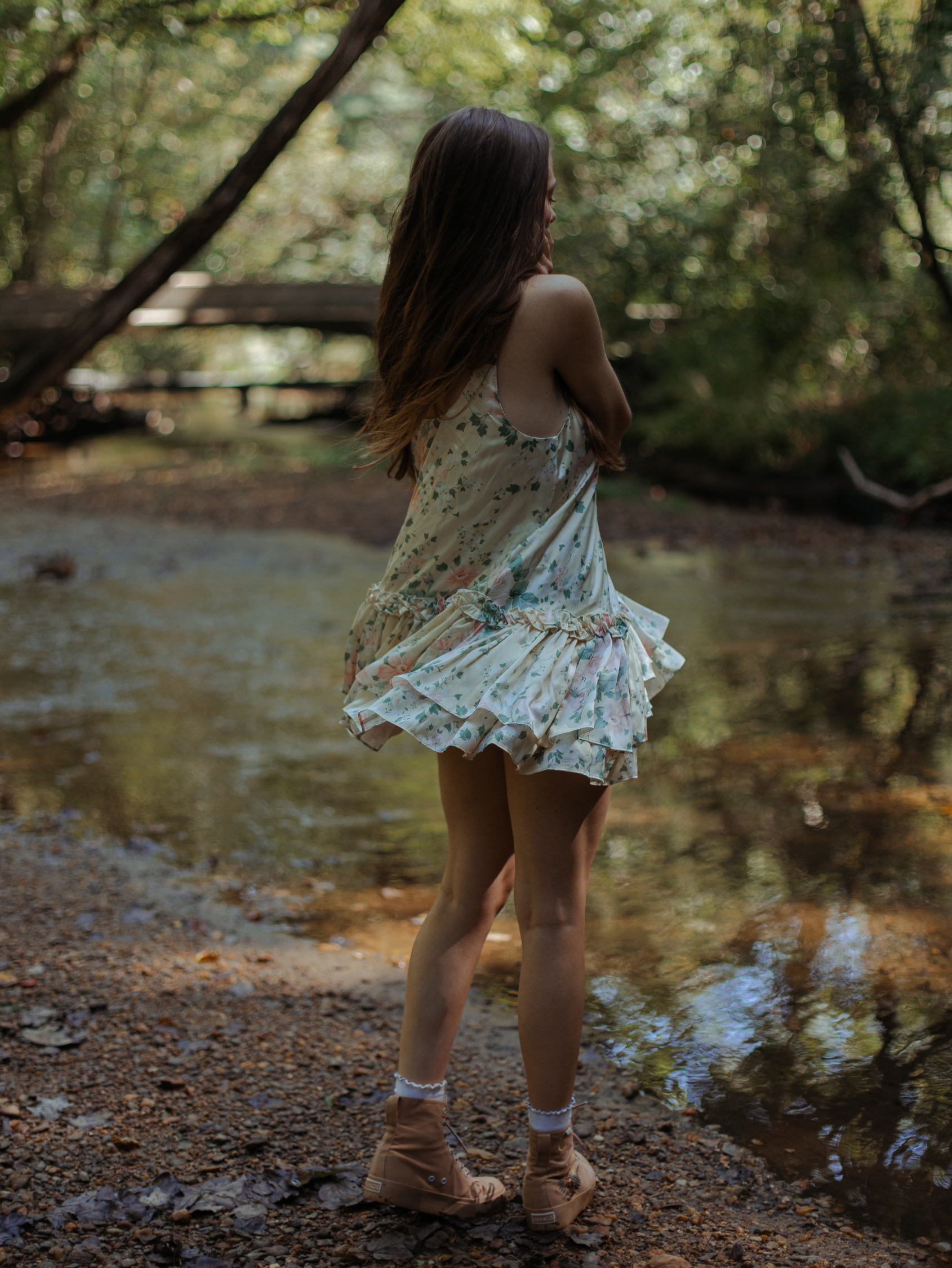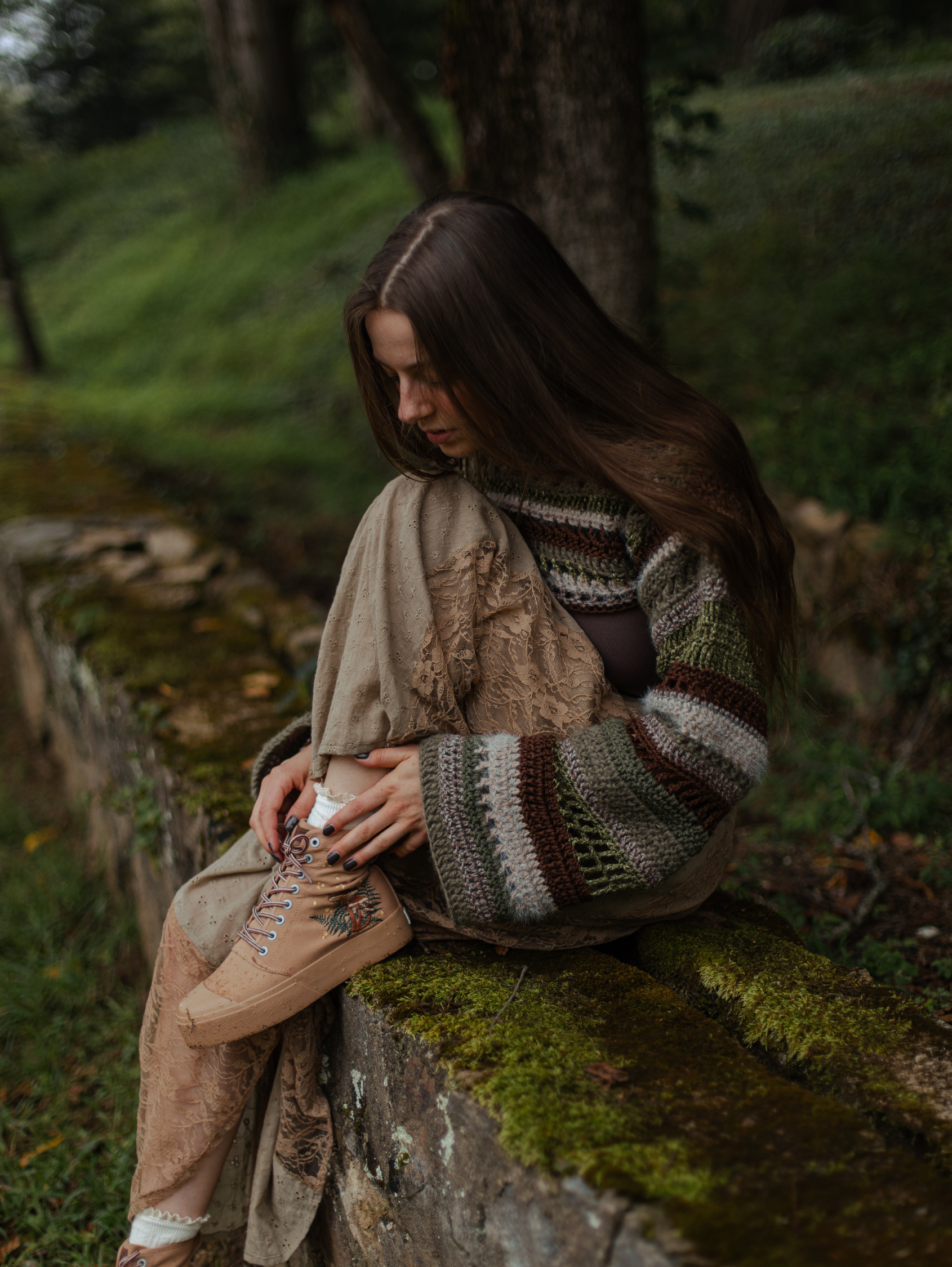 This stunning shoe is a fully embroidered design created in collaboration with Hannah Drapinski. The sole is 1.5 inches (our normal shoes have 0.9 inch soles) and the high top part around your ankle is ~ 1 inch higher than our normal high tops. This canvas is our Zion Sand khaki color.